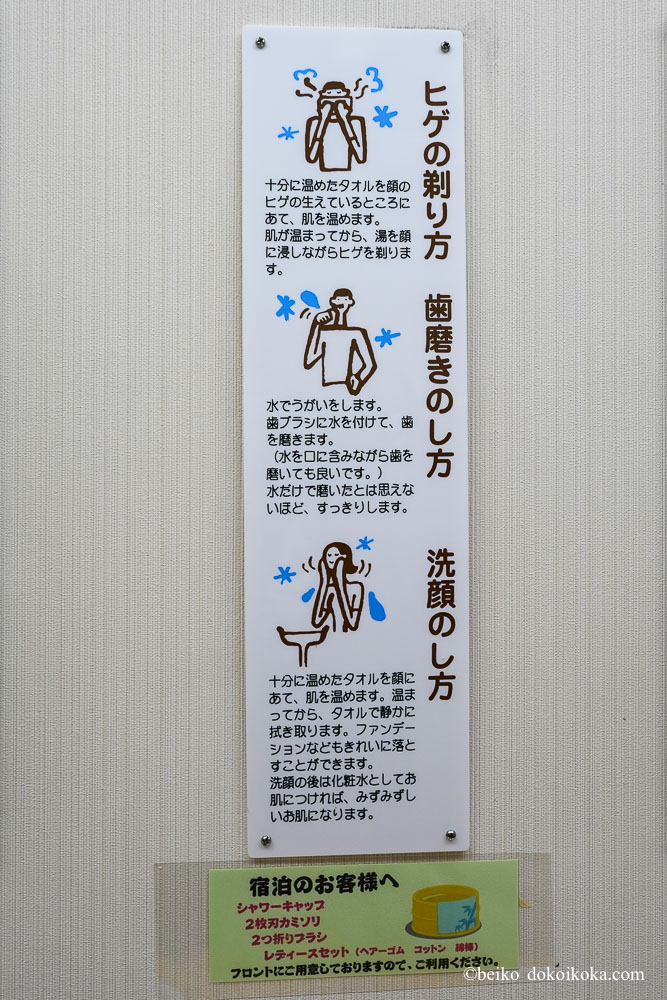 女性にはなかなか(唯一の)厳しいルールだったけど「旅は、郷に入っては郷に従え」。張り紙のアドバイス通りに滞在中にお湯で洗髪してみました。特に不具合はなかったです。