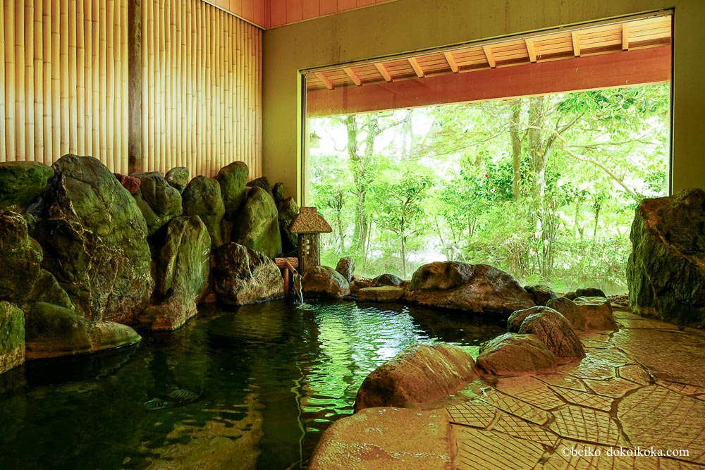 昔の銭湯みたいに男女の壁が上だけ開放されています。だから天井が高くて尚更気持ちよい。